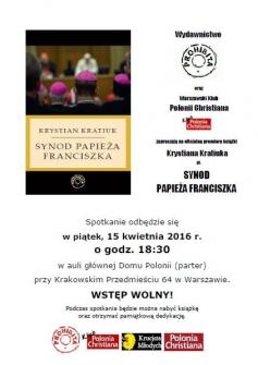 Już w najbliższy piątek, 15 kwietnia o godz. 18:30 warszawska premiera książki Synod papieża Franciszka autorstwa Krystiana Kratiuka. Szczegóły dotyczące spotkania na bieżąco na Facebooku.
