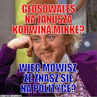 Czy nie jest to ta sama głuchota, na którą zachorowaliśmy przy wyborze Wałęsy „Bolka” na prezydenta Polski i pozwoliliśmy, z malutkimi przerwami, rządzić postkomunie przez 30 lat? I czy nie te same służby, tym razem działające nielegalnie, prowadzą z Polakami grę wyborczą według utrwalonego schematu? Choroba korwinizmu to margines, choć mocno denerwuje i oburza. Trochę jednak wstyd, gdy młodzi ludzie ulegają cynicznej propagandzie pajaca z siekaczami pod muszką.Odpowiedź na pytanie, dlaczego kolejną partię, uformowaną jedynie na potrzeby wyborów, tak właśnie prowadzi wódz, by nie wygrać wyborów, pozostawiam kontrwywiadowi i służbom specjalnym. Nie mnie to rozstrzygać.