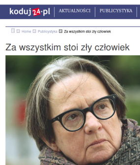 Przedziwny ten portal koduj24. Owszem, prawicowe portale bywają dziwniejsze. Ale tutaj dziwność polega głównie na kompletnym braku oryginalności i świeżości. Kolejny to już po natemat.pl portal anty-PiS. Widać jednak po nim kompletne wypalenie, brak nowszych refleksji, zafiksowanie na jednej postaci, którą trzeba zniszczyć i opluć. Ale najlepszy jest oczywiście wywiad z Agnieszką Holland. Wróg nr 1 to Kaczyński. Wróg nr 2 to Macierewicz. Wróg nr 3 to „zakompleksiali Polacy”. W sumie: PiS.