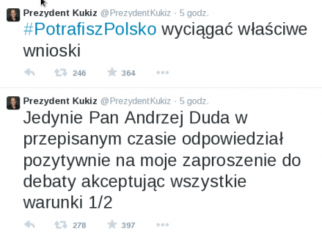Prezydent Duda wygrał głownie dzięki temu, że PO odurzone swoją propagandą w nieskrępowany sposób prezentowała patologie, które wytworzyła. PiS również jest nimi nękany ale jakoś zdołał powstrzymywać się przed ekscesami. Jeden tam palnął, żeby blablacary opodatkować drugi: że głos oddany na Kukiza to głos stracony ale tak to panowali nad sobą, żeby przekaz sensowny formułować.